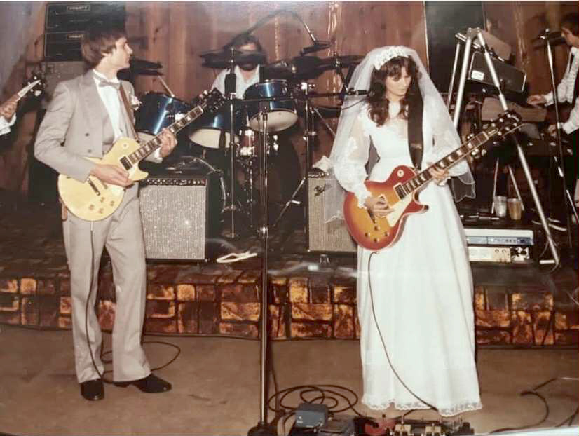 Lead guitarist for SINGE, Susan Hanke said, “Jim and I have played music together for 40-plus years.” The couple didn’t even stop for their wedding, as evidenced by the accompanying photo.