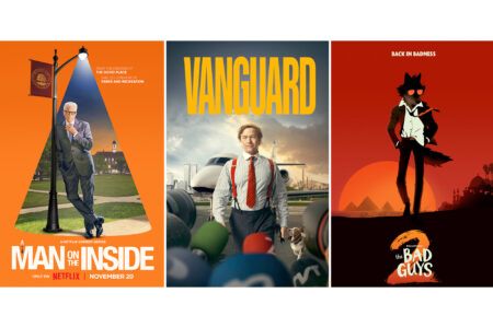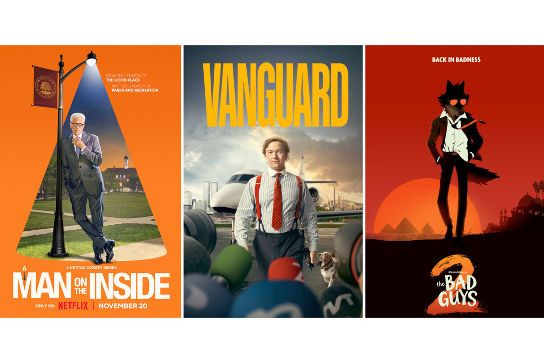 This combination of images shows promotional art for the series "Man on the Inside," left, the series "Vanguard," center, and the animated film "The Bad Guys 2." (Netflix/Viaplay/DreamWorks Animation via AP)