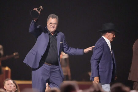 Vince Gill accepts the lifetime achievement award during the 59th-annual Country Music Association Awards on Wednesday at Bridgestone Arena in Nashville, Tenn. George Strait looks on from right.(AP Photo/George Walker IV)