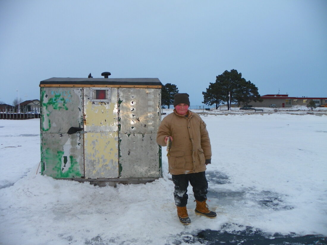 I left the library where I worked only a few blocks from the ice. I parked in Ludington Park, pulled on my boots and walked to my son’s shack.