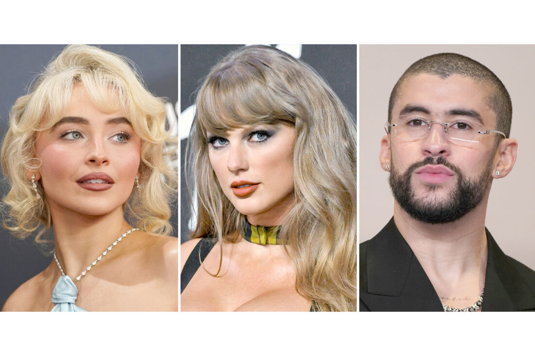 This combination of photos shows Sabrina Carpenter, left, Taylor Swift, center, and Bad Bunny. (AP Photo)