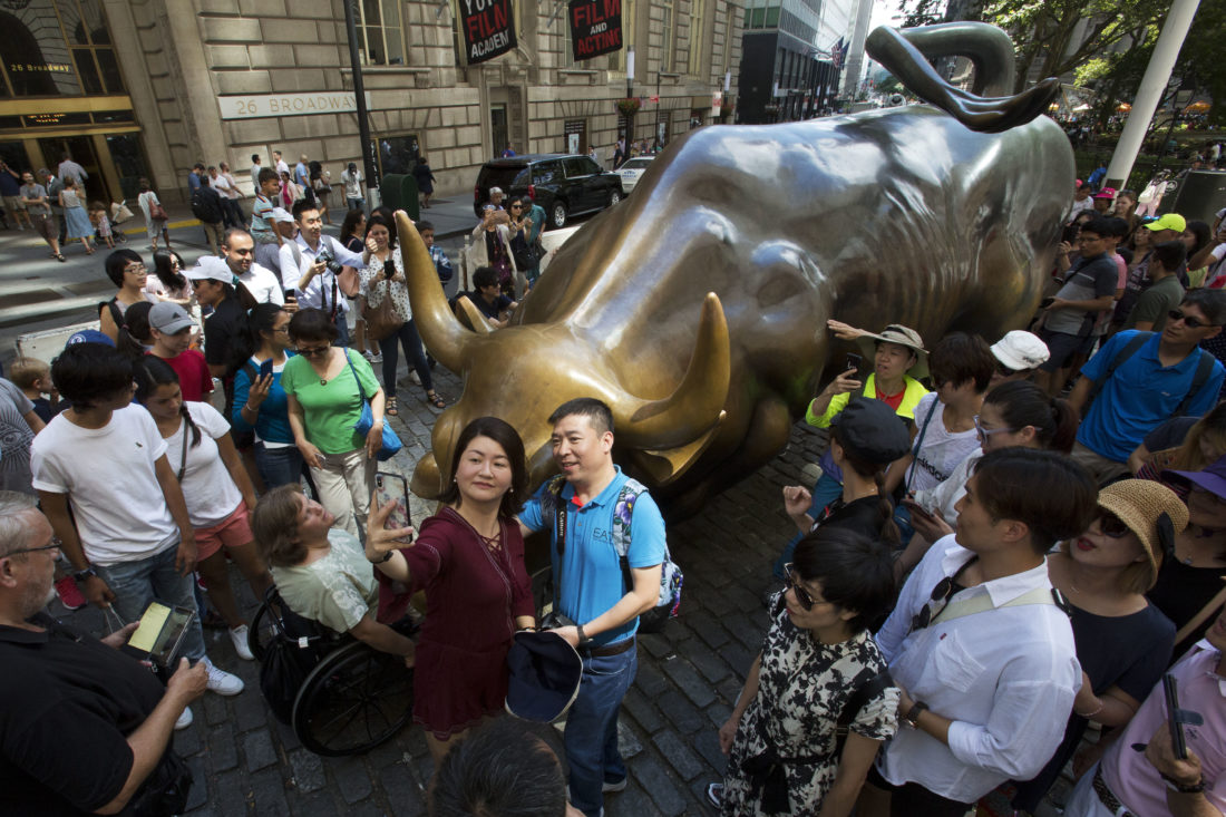 In this July 31, 2018, file photo tourists crowd around the Charging Bull statue in New York's financial district to take photos. Whether you’re planning a trip to a country across the globe or packing the car for a weekend road trip to a local campground, you can have a debt-free vacation with some careful planning. (AP Photo/Mark Lennihan, File)