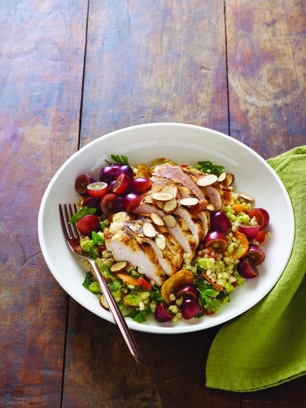 Toss couscous mixture with vinaigrette and portion into four bowls. Top with sliced chicken, red grapes and almonds.