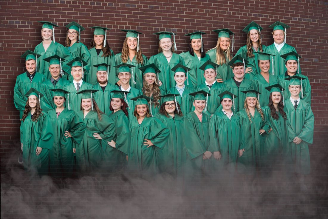 Graphic illustration courtesy of Korinne Lamoreaux, EverWild Photography While all the graduates wore masks and were socially distanced for the mass and ceremony on Aug. 11, Korinne Lamoreaux of EverWild Photography snapped individual photos of each graduate unmasked and later edited the photos to make this composite image. The graduates depicted are, front row, left to right: Madelyn Wilson, Sydney Sands, Kiera Reimer, Riley Martin, Sophia Derkos, Isabella Belhumer, Seth Wisotzkey, Carter Beversluis, Mara Liss, Autumn Peloza-Sexton, and Roman Zeise. Middle row; second row left to right: Zachary Barron, Isaac Sarles, Evert Olson, Spencer Kareckas, Anthony Derkos, Carley McInerney, Logan Fields, Jacob Brown, Thomas Benoit, Samantha Manninen, and Gabriel Mantela; back row, left to right: Kamryn Patmythes, Katelyn Rexford, Natalie Spreitzer, Ella Boney, Piper Burrows, Ellah Cooper, Natalie Williams, Annabelle Neumeier, and Parker Ryno.