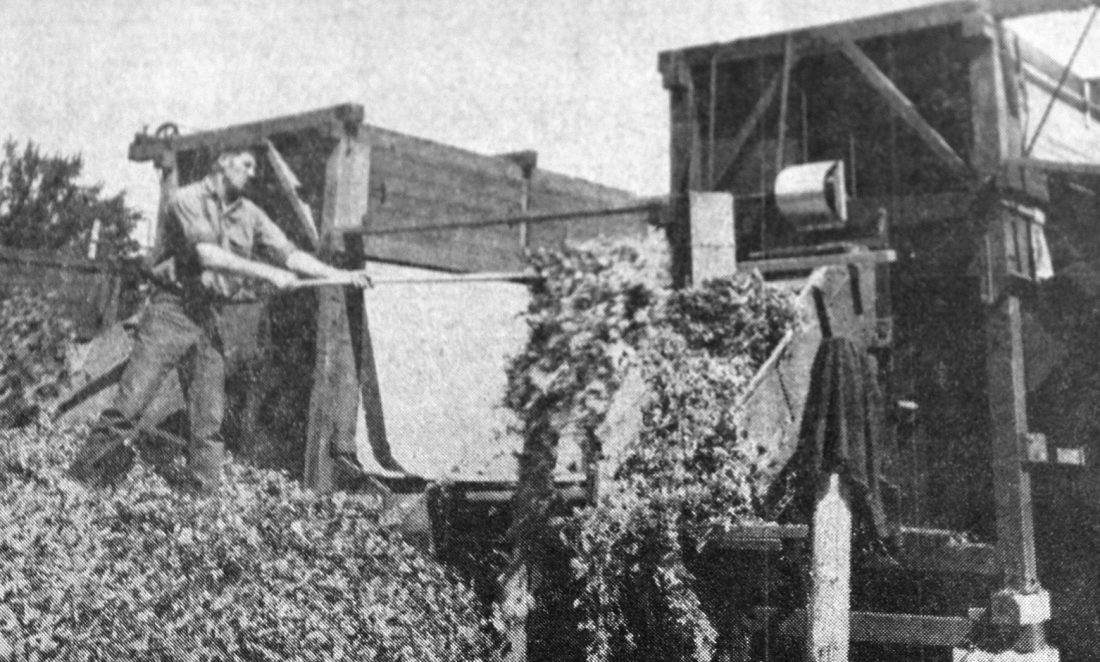Daily Press file photo Vining machines separate the peas from the vines in 1958. Henry Belongia forks pod-laden vines into the machine at Beauchamp’s Grove in Flat Rock.
