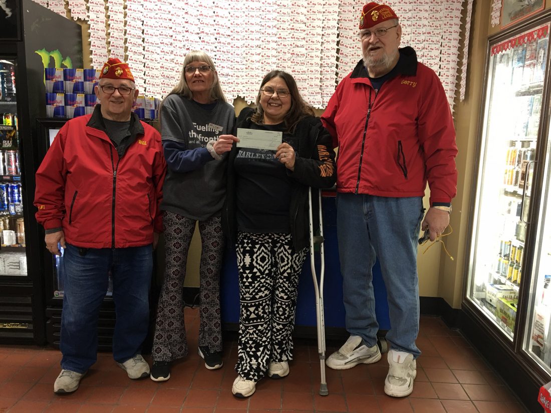 White’s Grocery recently made a donation of over $3,000 to Toys for Tots. Shown accepting the check are Bill Lamarche, left, and Gerry Rivard, right. Presenting the check are Lynn Cole, center left, and Tina Garb, both of White’s Grocery.