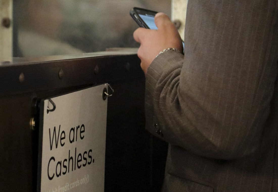 FILE - In this Jan. 23, 2020 file photo, a restaurant sign alerts customers that it's now "cashless," in New York. One year ago, the coronavirus pandemic forced business closures and lockdown orders. In the 12 months that followed, many aspects of daily life have changed, including how we handle money, both physically and philosophically. (AP Photo/Bebeto Matthews)