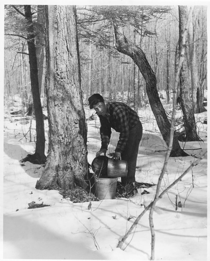 Families and neighbors would gather from miles around. Lots of helping hands were needed for drilling, tapping, hauling pails and boiling gallons and gallons of sap.
