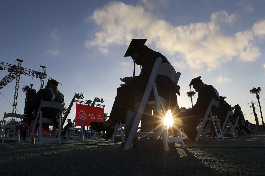 FILE - In this May 7, 2021 file photo, University of Texas Rio Grande Valley graduates sit social distanced in the early morning sunrise during their commencement ceremony at the schools parking lot in Edinburg, Texas. Repayment will restart as of Oct. 1 for 42.9 million student loan borrowers with federal debt. Vulnerable borrowers may not be ready to make payments, but there are options to find legitimate student loan help and avoid default — the consequence of missing payments. (Delcia Lopez/The Monitor via AP)
