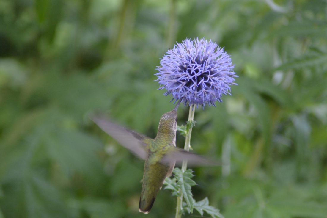Karen Wils photo A hummingbird checks out a globe thistle.