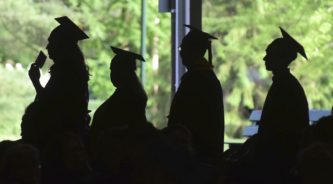 FILE - In this Friday, June 1, 2018,, file photo, graduates are silhouetted against the green landscape as they line up to receive their diplomas at Berkshire Community College's commencement exercises at the Shed at Tanglewood in Lenox, Mass. Critics of traditional four-year degree programs say grads leave burdened with student loans and no clear path to a career. But experts say the four-year degree is still a good investment since it leads to higher overall lifetime earnings compared to workers without a degree. (Gillian Jones/The Berkshire Eagle via AP, File)