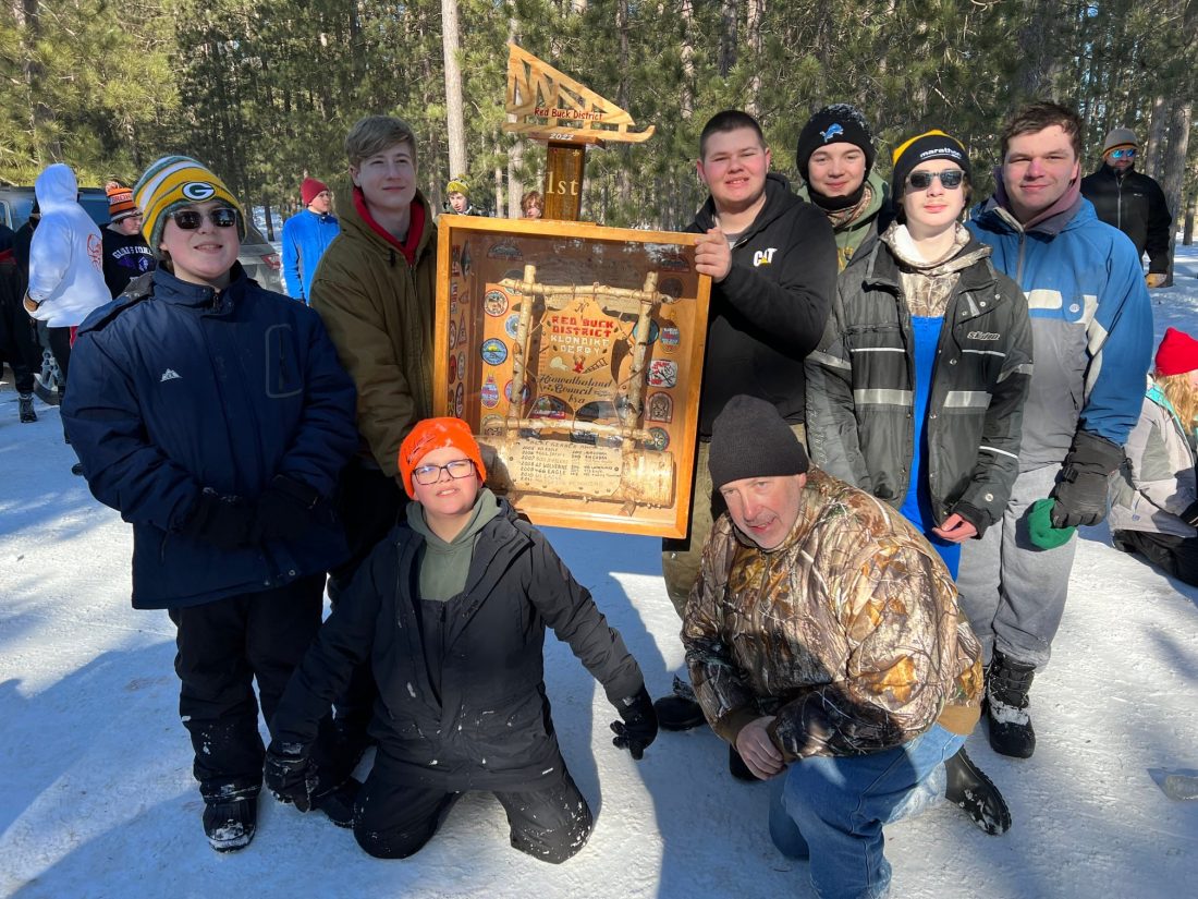 Courtesy photo The Lumberjacks Patrol of T-400, Manistique, poses for a photo with the first place Gerber Trophy they earned at this year’s Red Buck Sub-District Klondike Derby.