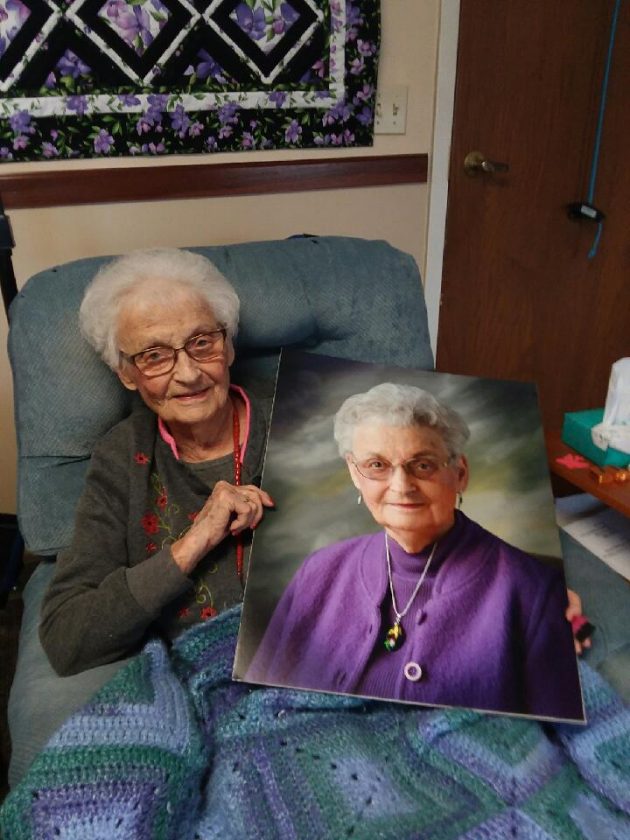 Courtesy photo Veronica (Thiverge) Paeske, age 102, is shown is holding her 90th birthday photo.