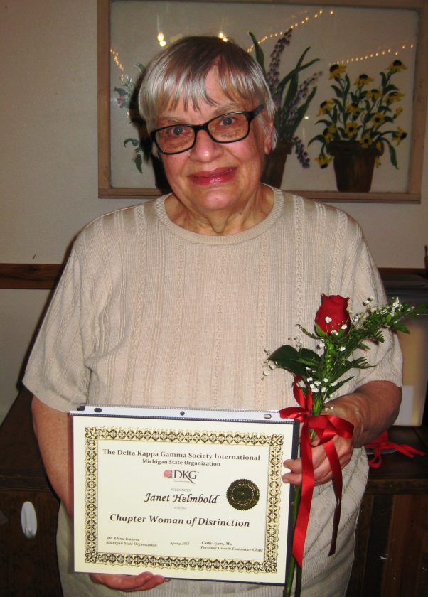 MANISTIQUE — Beta Sigma Chapter of Delta Kappa Gamma has honored Janet Helmbold of Manistique, as the Chapter Woman of Distinction for 2022. She has been a member of DKG since Margaret Rittenburgh sponsored her for membership in 1984. At the May 14 meeting, held at the Little Nugget Golf Course Clubhouse near Menominee, she was presented with a rose, a certificate, a pin, a gift, and a notebook binder containing letters and testimonials commending her on her educational and community service and involvement. Helmbold comes from Millington, Mich., a 1963 graduate of Millington High School. Helmbold has two brothers, Chris Helmbold (Paulette), from Augusta, Mich., David Helmbold from Ann Arbor, and one sister, Karen Steele from Millington, Mich.