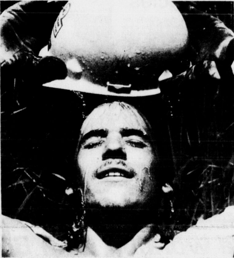 Dan Sealy, age 21 in this photo run in the July 26, 1986 edition of the Daily Press, was a Gladstone resident and Youth Corp employee working on the Days River Cross-Country Ski Trail, northwest of Gladstone. Sealy took a break from the recent heatwave, when temperatures near 100 degrees, by cooling off in a cold stream. In this photo, his hard hat provided a brief refreshing shower.
