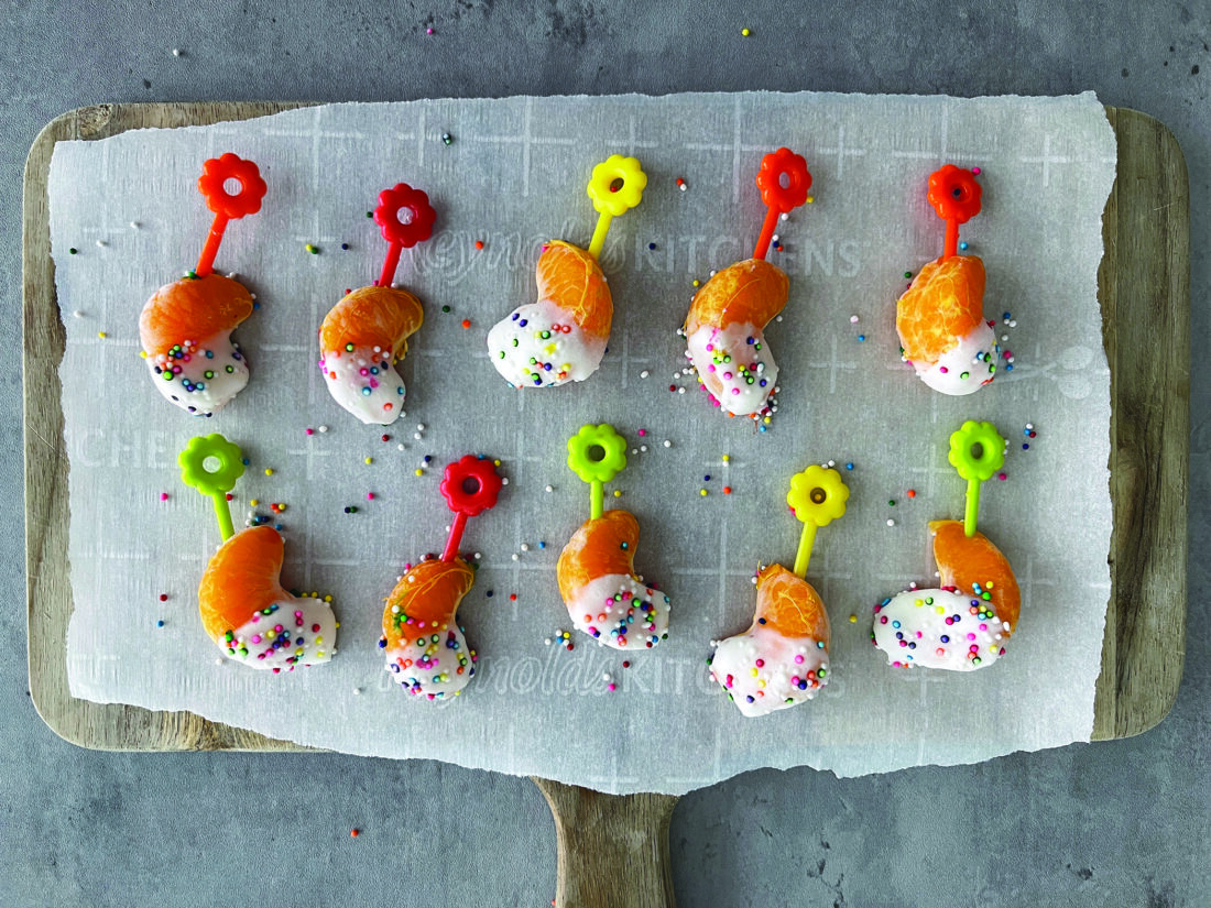 Dip each mandarin slice in yogurt, covering about half of each slice. Place individual mandarin slices on parchment paper. Add sprinkles.