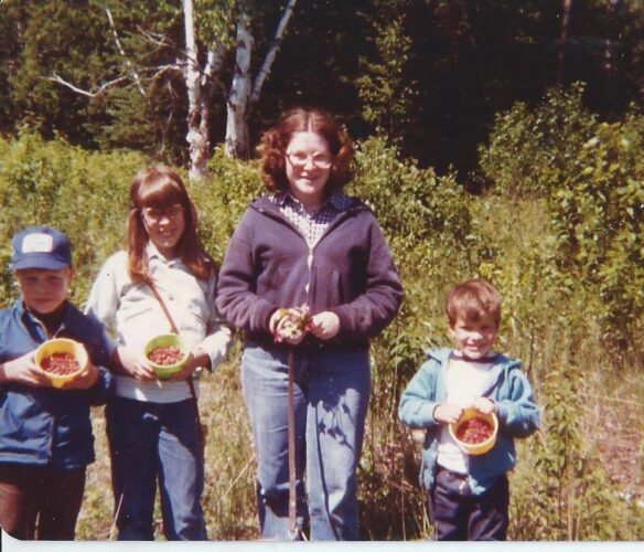 At right, shown picking wild strawberries near camp are cousins Jeff Verbrigghe, Sherrie Salmi, my sister Lori and Andy Hendrickson, circa 1975.