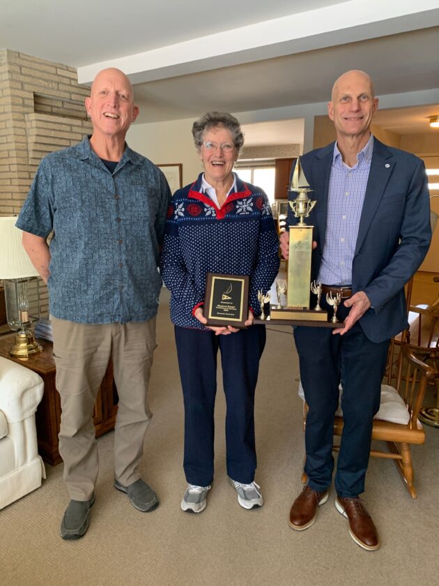 - Courtesy photo Escanaba Yacht Club Commodore Mark Meyer, left, and Vice Commodore of Sail John Anthony, right, present the award of Yachtsman of the Year to Marilyn Kinsey, who is sharing the title with Lori Sprague.