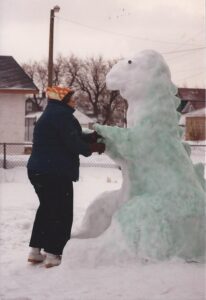 Over the years my family and I have created some interesting snow critters in various locations. Making snow creatures challenges the imagination. I remember a snow hound made near camp with Dad’s wool socks used for ears. I’ll never forget the year my mom got up at dawn to mix green food coloring and water to go and spray a snow dragon green.