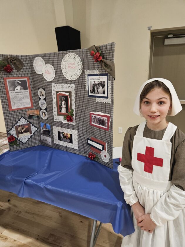 Another figure was Violet Jessup, the “unsinkable” Titanic survivor, brought vividly to life by student Miranda Groleau in a crisp nursing uniform. Visitors listened as she described surviving the collisions of both the Olympic and Titanic ships, then serving as a nurse aboard the Britannic during World War I.