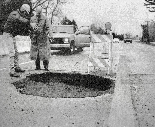 Roger VanDrese, right assistant Delta County engineer superintendent and Doug Bovin, Delta County Board chairman, study a large hole near the Portage Creek bridge on M-35. An approximately 100 cubic foot hole developed Thursday evening due to pressure from the creek against the bridge.