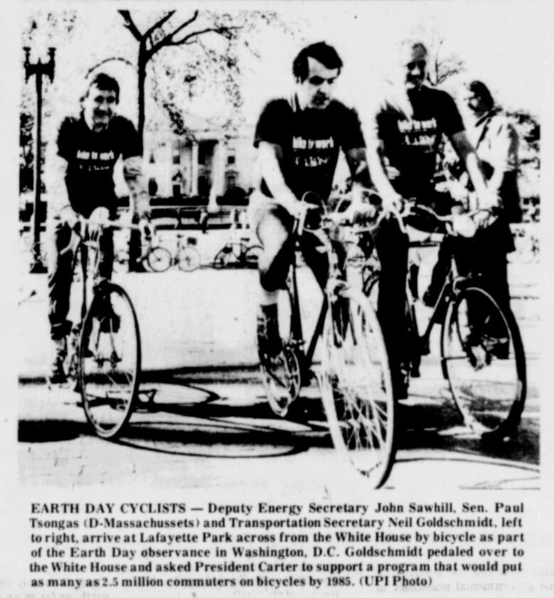 Published in the Daily Press in 1980, this photo shows Washington, D.C. officials wearing "bike to work" t-shirts as they promoted an initiative to get commuters to switch to cleaner, healthier methods of travel on Earth Day.