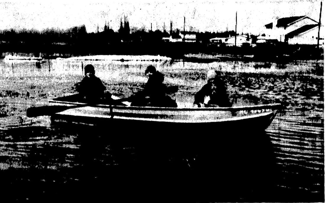 Taking advantage of the spring thaw in the city, these three youths manage to get in a little boating by hitting the “high seas” in a vacant lot north of the New Jefferson School. The young sailors are, left to right, Ricky Ness, 1807 16th Ave S, and Steve and Pat Geurls, 1710 S 18th St. The stowaway being held by Pat is named “Snoopy.”