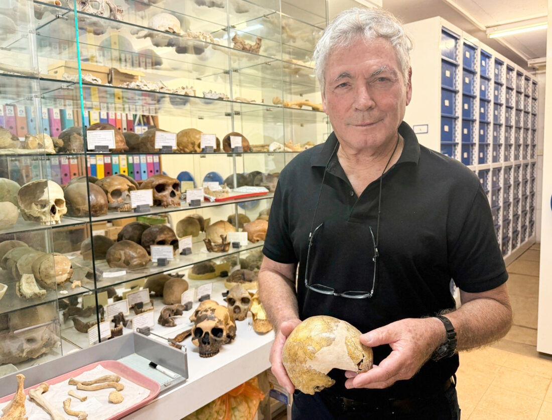 In this undated photo provided by Tel Aviv University, lead researcher Israel Hershkovitz holds the skull of a child thought to be from interbreeding of humans and Neanderthals, in Tel Aviv, Israel. (Tel Aviv University via AP)