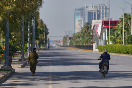 An army soldier, left, walks as police officer drives motorcycle on an empty road ahead of second round of negotiations between the U.S. and Iran, in Islamabad, Pakistan, Monday, April 20, 2026. (AP Photo/Anjum Naveed)
