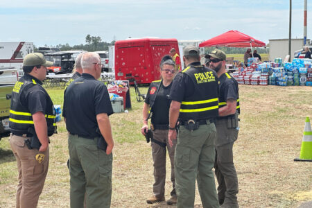 - Officers huddle at the command center for officials battling a wildfire in Nahunta, Ga., Wednesday, April 22, 2026. (AP Photo/Russ Bynum)