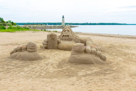- One of this summer’s sand sculptures, this one an enormous Sasquatch relaxing with a tropical drink on the Lake Michigan beach near the Gladstone lighthouse.