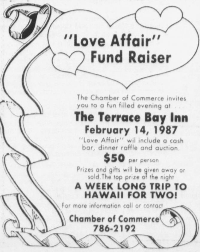 - This image shows the official invitation in the Daily Press for the Chamber’s inaugural Love Affair fundraising event, held on February 14, 1987.