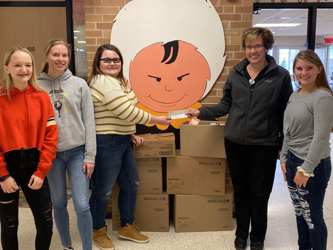 The staff of Bishop Noa Home conducted a food drive for the Escanaba Junior/Senior High School Food Pantry and was able to donate six boxes of food. They also did a bake sale that raised $300 for the Food Pantry needs. Key Club members will do the shopping when the pantry runs low on specific items. The food pantry is utilized multiple times weekly for students in need and they can choose items that they know they will eat. Students go through the school social worker, Mrs. Bink, who is located in the Student Services Office, to access the pantry. Highly utilized foods include canned soups and meals, spaghetti noodles and sauce, macaroni and cheese, complete dinner meal kits, cereal, peanut butter and jelly, any type of breakfast bars, granola bars, pop-tarts, crackers, or other snacks. Shown, from left, are Key Club members Adrian Brazeau, Courtney Johnson, Erin Davidson, Susie Cobb from Bishop Noa Home, and Key Club member Abby Hill.