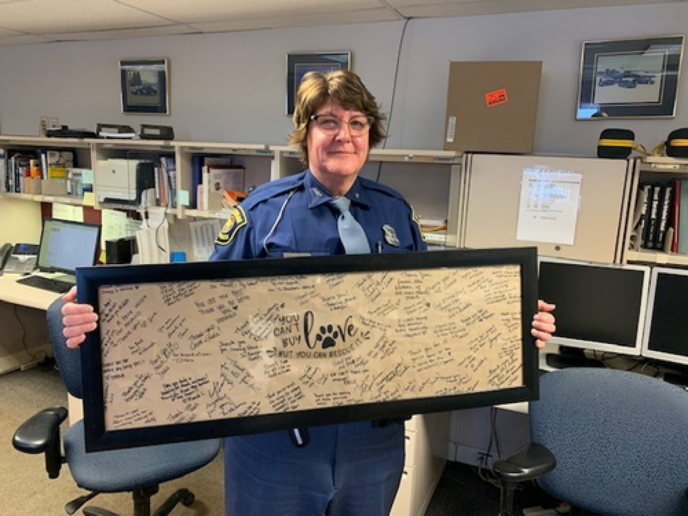 Michigan State Police photo Trooper Lisa Kanyuh poses for a photo with a sign given to her by the families that adopted animals that were seized or born to animals that were seized from an alleged puppy mill last year.