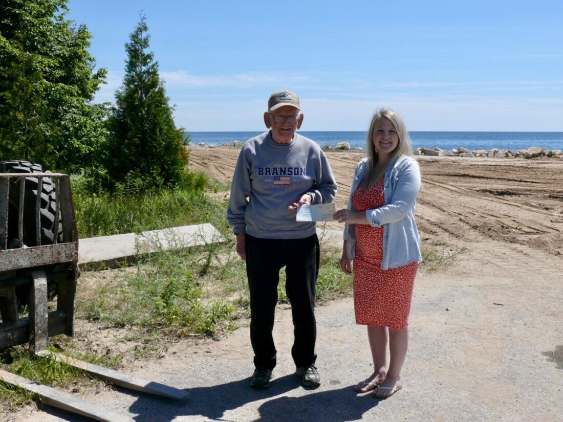 Courtesy photo Dick Ketcik, left, chairman of the Manistique Downtown Development Authority board, accepts a $3,000 check from Alyssa Swanson, president of the Schoolcraft County Community Foundation, at the boardwalk. The funds will be used for repairs and improvements to the Manistique boardwalk.