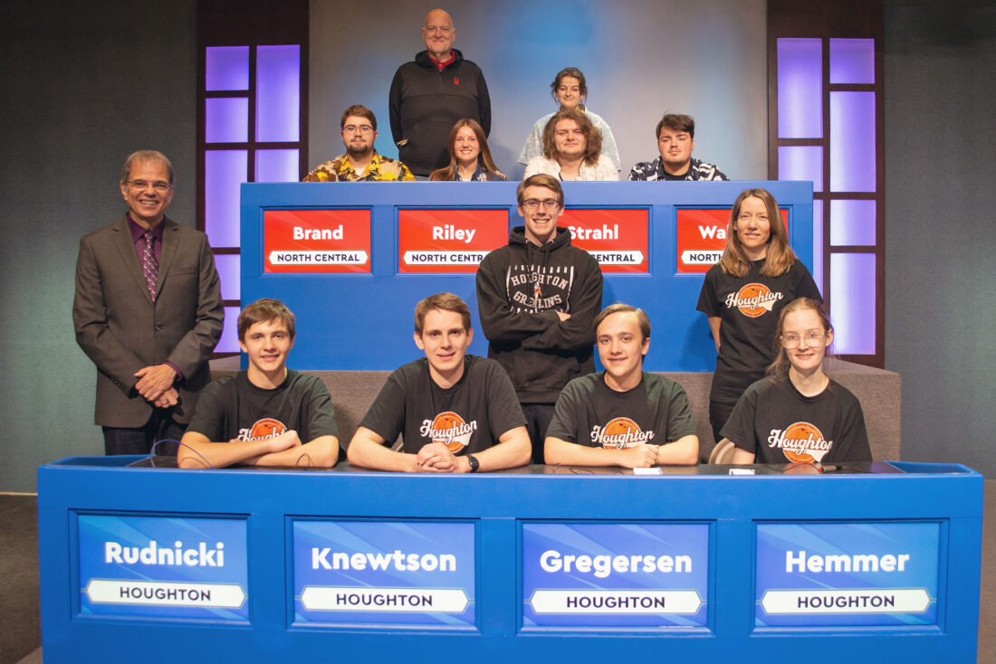 The North Central Jets played the Houghton Gremlins in the first round of High School Bowl and were defeated by a score of 280-120. Representing North Central, seated from left, are players Dawson Brand, EllaRiley, team captain Carter Strahl and Jaden Walters. Standing is alternate BreanaStrahl with Coach Matt Stein. Players for Houghton are, seated from left, PeterRudnicki, team captain Thomas Knewtson, Tyler Gregersen and MeghanHemmer. Standing is alternate Brad Burns with Coach Rebecca Keyes. HighSchool Bowl host Jim Koski is standing at lower left.