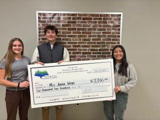 The Manistique Area Schools Math Class recently received a $2,200 grant to purchase five two-person interactive white tables and one collaborative white table. The grant came from the Schoolcraft County Community Foundation’s Kellogg Fund and was one of five grants awarded during the SCCF’s fall grant round. Kellogg Fund awards are based on recommendations from SCCF’s Youth Advisory Committee, which reviews youth-related grant applications. YAC members Maya Carlson and Carsyn Hinkson present Jenna Nagy, MAS math teacher, with a grant check for whiteboard tables in her classroom.