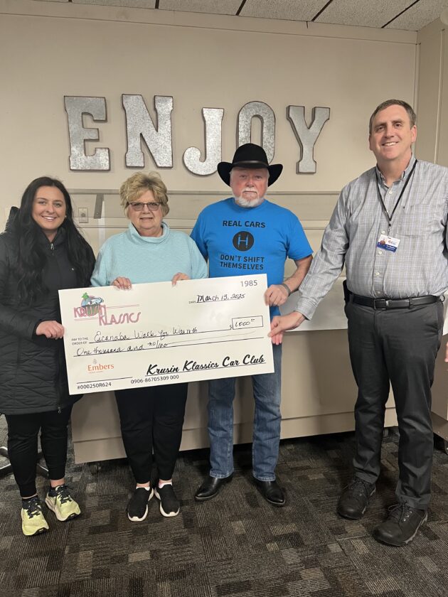 Krusin Klassics Car Club donated $1,000 to the Walk For Warmth 2025. Pictured from left are Hannah Micheal (WFW), Janet Snowden and Mark Caswell (Krusin Klassics), and Gary Willoughby from Community Action Agency.