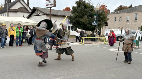 The Viking Re-enactors demonstrate combat during the 2024 Leif Erikson parade in Norway. Viking Village will again be set up across from City Hall for this year’s Leif Erikson Festival event Saturday. (Terri Castelaz/Daily News)