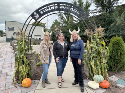 Norway will honor its Scandinavian heritage during its 33rd-annual Leif Erikson Festival on Saturday. The event kicks off with the Leif’s Run at 9 a.m. Central time and concludes with the Viking Burial and Funeral Pyre at 7 p.m. Central at Strawberry Lake. From left, Norway Downtown Development Authority Interim Coordinator Kenzie Williamsen, festival volunteer organizers Monica McElroy-Denissen and Barbara Thorne get the city's Viking Square ready for the festivities. (Terri Castelaz/Daily News)