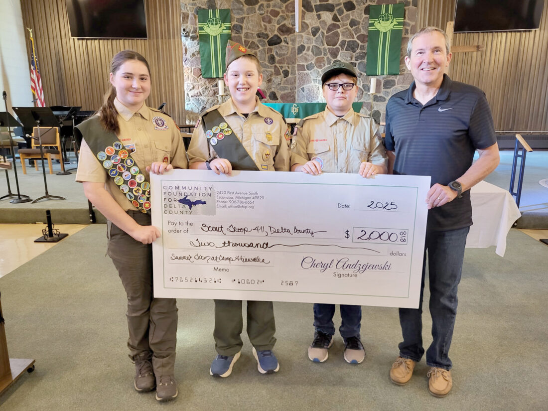 The Community Foundation for Delta County Grants Committee has awarded $2,000 to Scout Troop 411 Delta County for the summer term at Camp Hiawatha. The funds from the foundation's April 2025 grants round were used to help defer the costs of camp fees, uniforms and equipment. The Scouts received training in first aid, environment, swimming and other valuable skills as well. From left, Kennedy Markovich, Frank Landenberger and Ben Guindon of Scout Troop 411 Delta County accept the check from Charlie Becker, board chair of the Community Foundation for Delta County Grants Committee. (Courtesy photo)