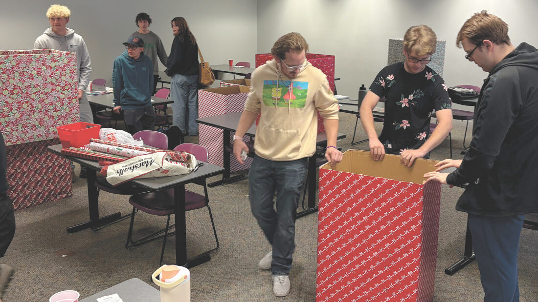 Bay College and Lake Superior State University Regional Chapter of Business Professionals of America students prepare boxes for the two-week 2025 Warm Coats for Warm Hearts campaign, which began Monday. (Submitted photo)