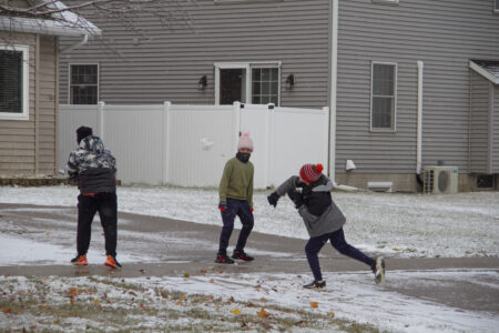 On Ninth Avenue South in Escanaba, three youths pivot from scooping shovelfuls of snow and autumn leaves to throwing them at one another.