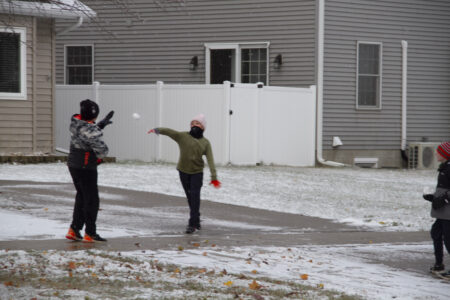 On Monday -- the first day of the season that snow stuck to the ground in Escanaba -- Robert Lee gently lobs a snowball toward Cedric Guindon, who raises a mittened hand.