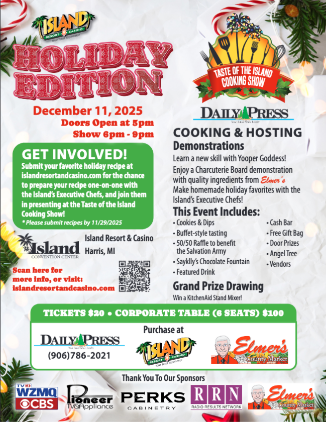 HARRIS — Do you have a holiday recipe that everyone raves about? Here’s your chance to have it showcased on stage at the third-annual “Taste of the Island” Cooking Show – Holiday Edition, taking place Thursday, Dec. 11, at the Island Resort & Casino, W399 U.S. 2 in Harris.
