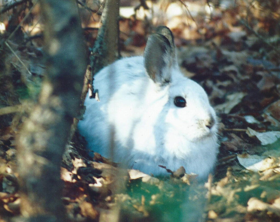 A snowshoe hare is already white for winter and hoping for some snow as camouflage. In November it eats bark, cedar and twigs. (Karen Wils photo)