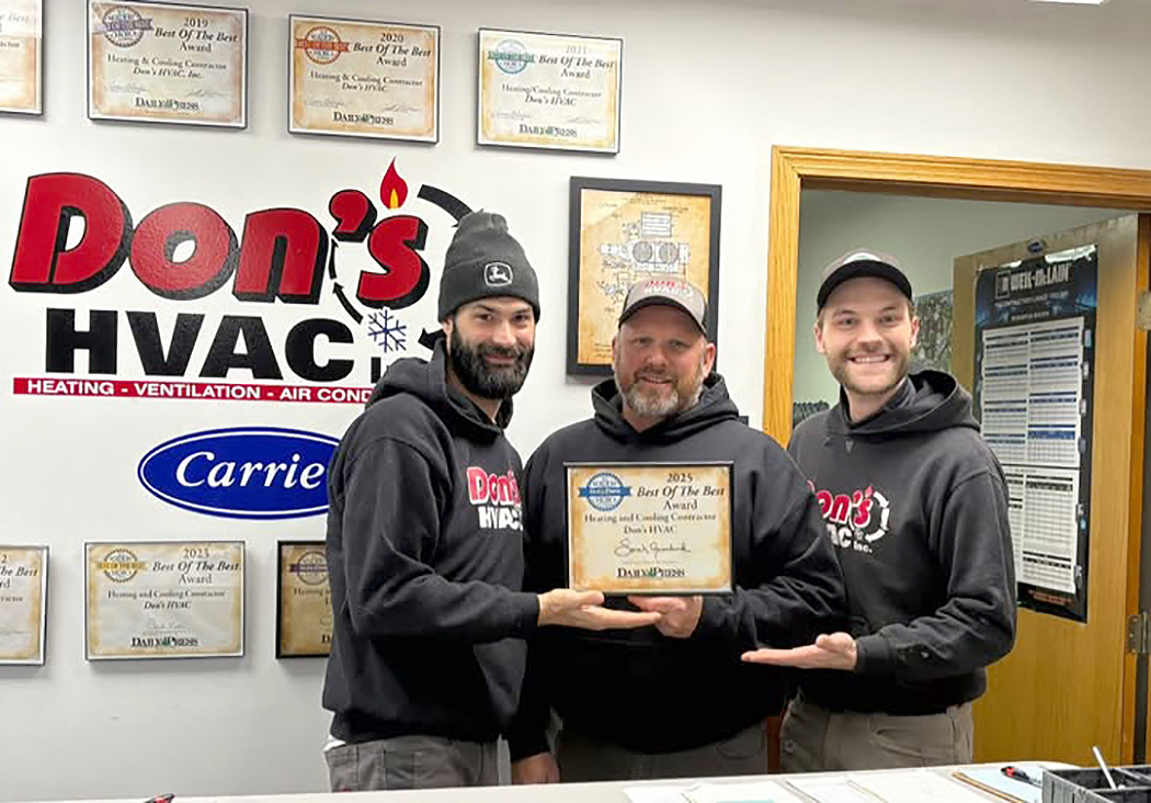 - Delta County Area Chamber of Commerce member Don’s HVAC celebrates receiving the Daily Press Best of the Best Award for Best Heating & Cooling Contractor. “To our amazing customers and community – your trust in us means everything. We’re committed to keeping your homes safe, comfortable and cozy all year long,” the company stated in a news release. “From all of us at Don’s HVAC, thank you for your support!” From left are Chad Verbrigghe, co-owner Dave Artley and Kris Ozanich. (Submitted photo)