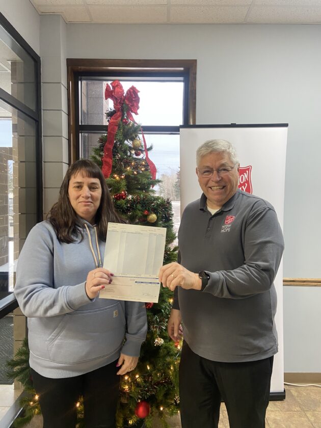 Capt. Doug Winters of the Salvation Army in Escanaba receives a $396 donation from Daily Press Marketing Executive Dawn LaPine. Funds were raised from the Daily Press "Thunksgiving" ad special, where a portion of the ad cost went directly to a local food pantry.