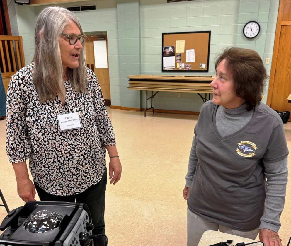 Beta Sigma member Christine Konyn Shepherd, left, who was also a nurse in the Vietnam War, is shown discussing mutual experiences with Mary Stoltz of Iron Mountain. Stoltz spoke to the group about the all-women U.P. Honor Flight earlier this year. (Contributed photo)