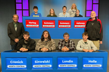 The North Central High School team recently played Sault Ste. Marie in WNMU-TV's "High School Bowl." From left, representing North Central — seated are AJ Holle, Brady Lundin, team captain Brayden Sinwelski, and Braeden Cronick; standing is coach Matt Stein. For Sault Ste. Marie, seated are players Braesyn Hering, Cora Sommers, team captain Nathaniel Sommers and Eleanor Maloney; standing is coach Kim Badenski. High School Bowl host Jim Koski is standing at lower left. (Contributed photo)